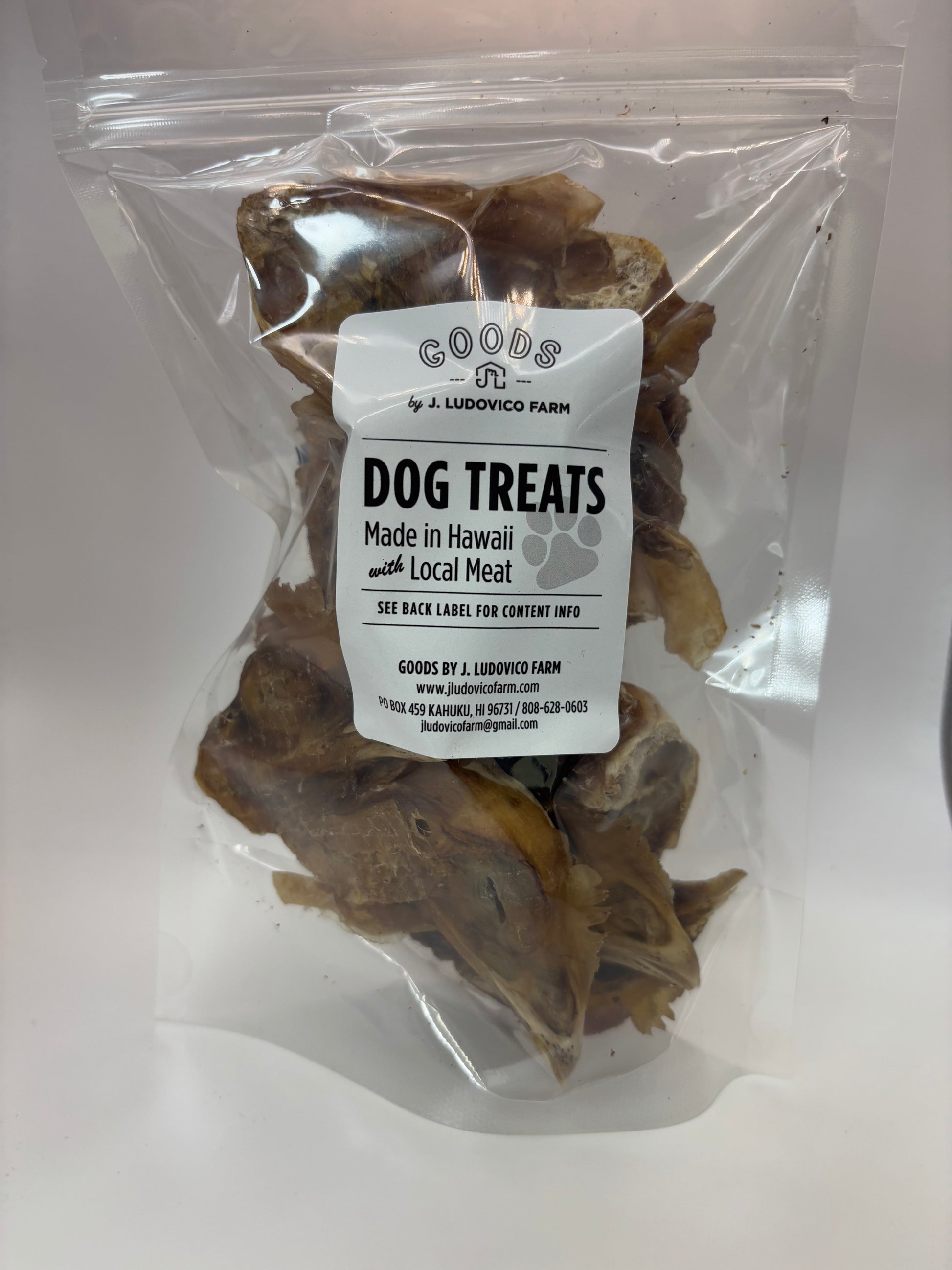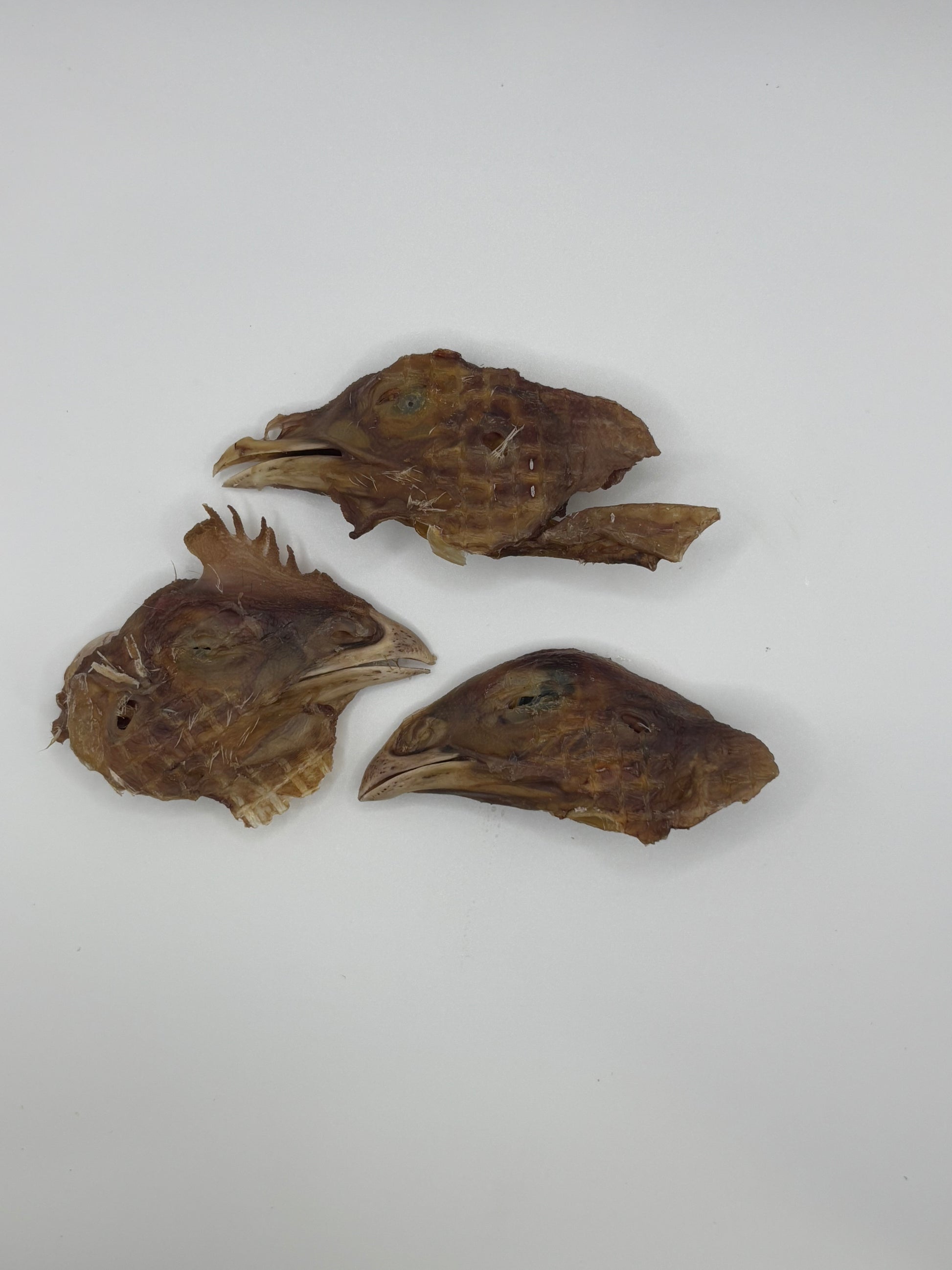 Chicken heads cut in half and dehydrated at low temperatures to ensure they are kept raw and are safe to eat by dogs.