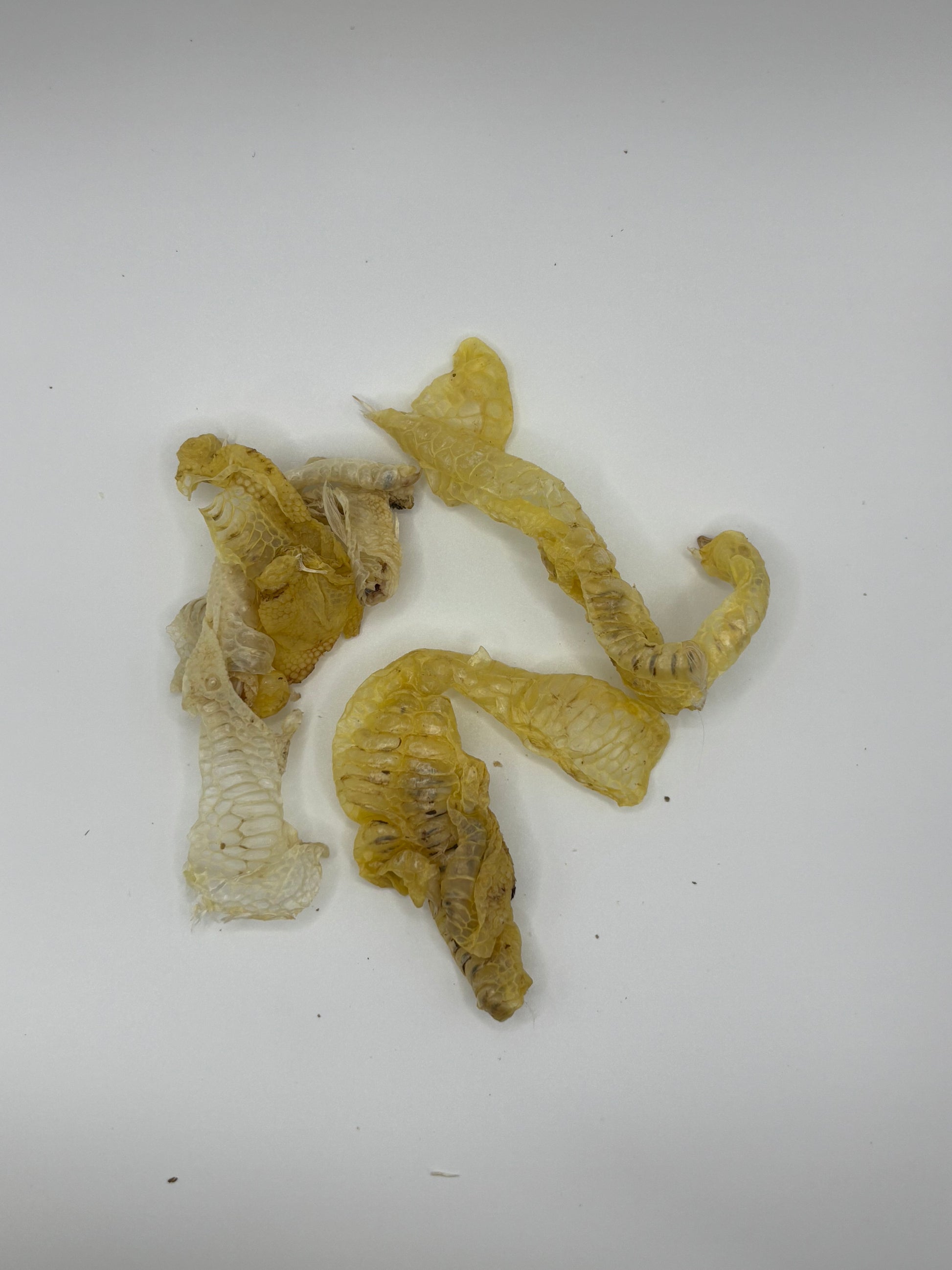 Skin is from the outer layer of the chicken feet. Dried at low temperatures. I like to call it doggie popcorn.