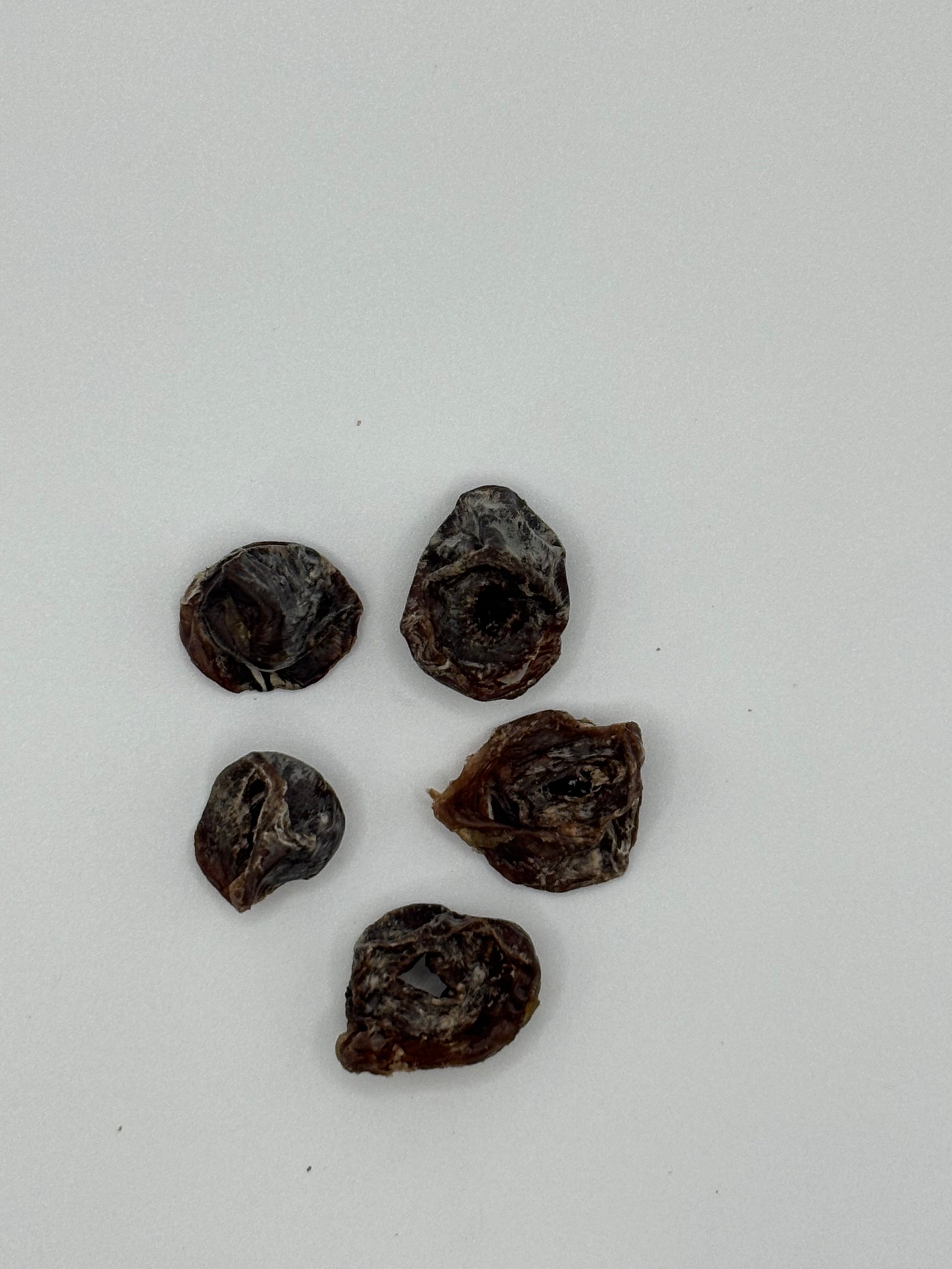 Hearts cut into small pieces and dehydrated at low temperatures.